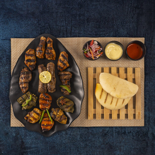 A colorful, delicious platter, containing an assortment of 14 mouthwatering kebabs (Chicken sheekh, Chicken tikka, Murgh malai, Murgh kali mirch, Murgh hariyali). Enough kebabs to fill even the hungriest of tummies.
